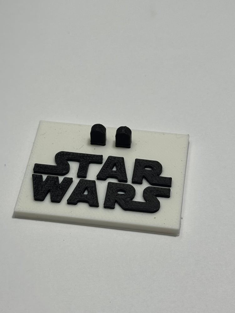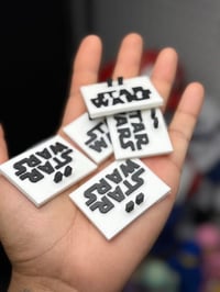 Set of 5 custom black and white Kaylabs minifig stands, designed with a clean white base and bold black Star Wars lettering. Perfect for displaying and organizing your favorite figures in style.